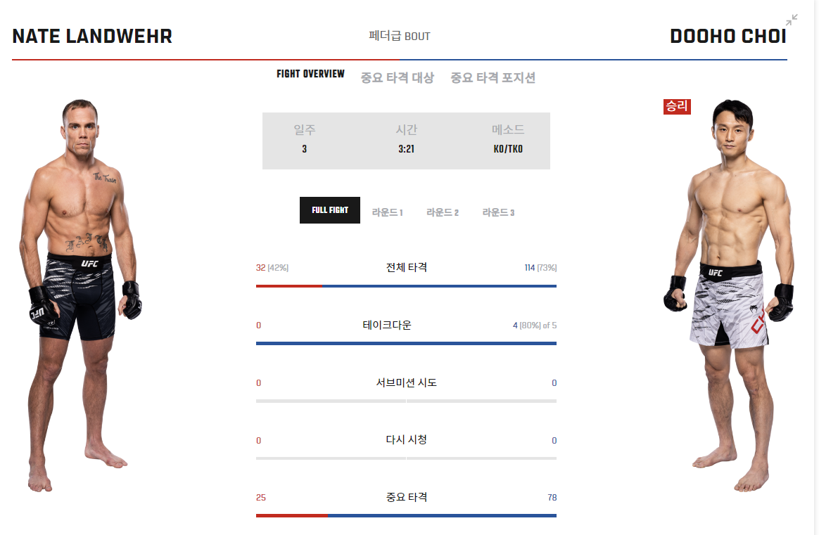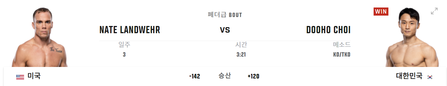 최두호 선수는 최근 UFC 310에서 미국의 네이트 랜드웨어를 상대로 페더급 메인 카드 경기에서 2라운드 21초 만에 TKO 승리를 거두며 2연승을 기록했습니다.